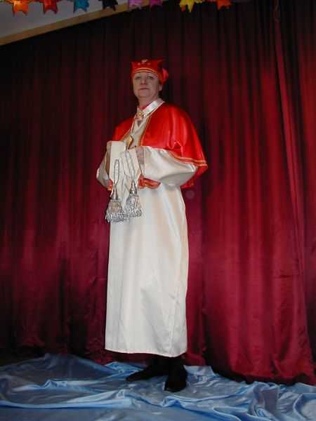cremefarbenes Seidengewand, roter Umhang mit vierzackiger Mütze und Kreuz
